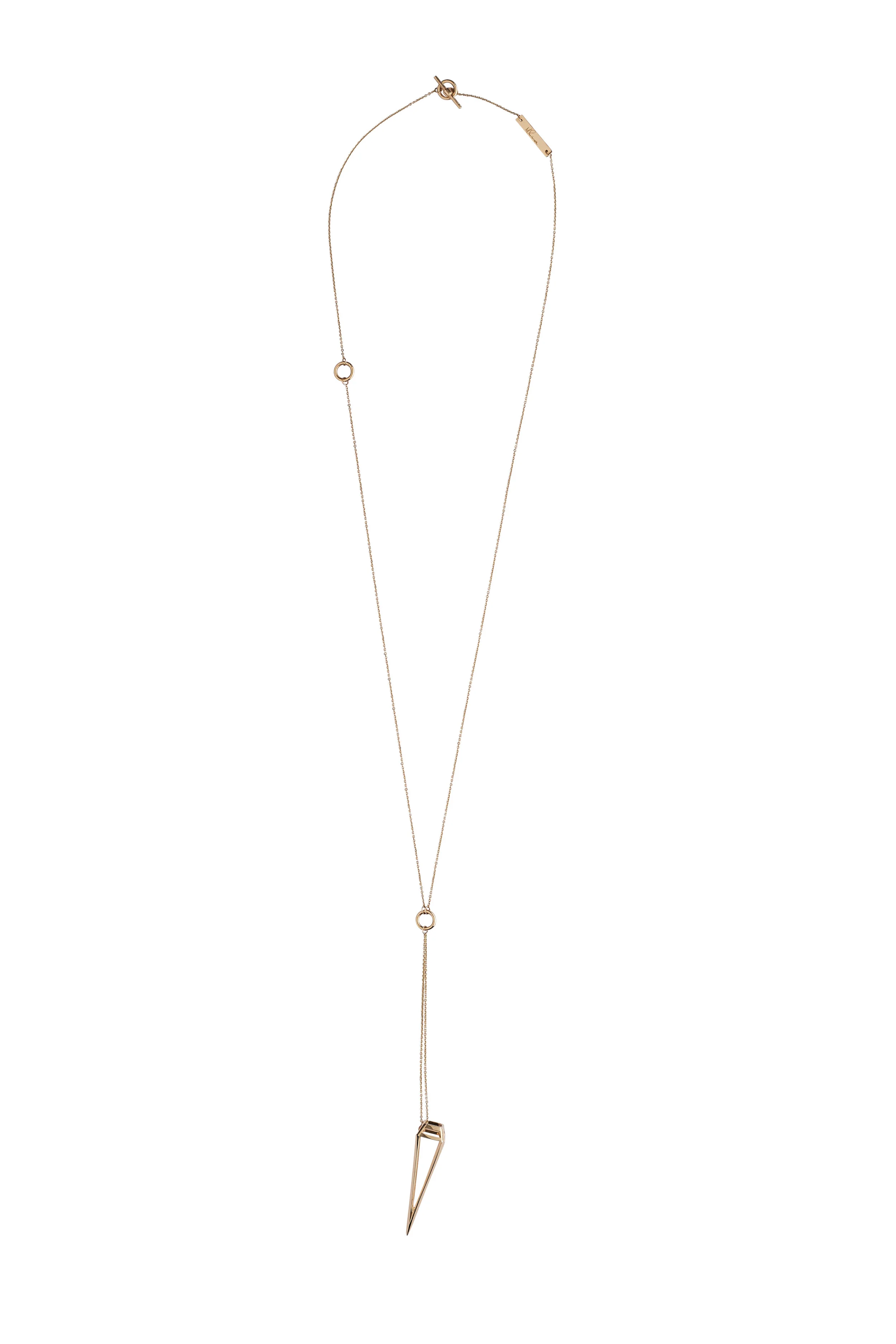 Open frame-work prism pendant, hangs from a delicate faceted chain